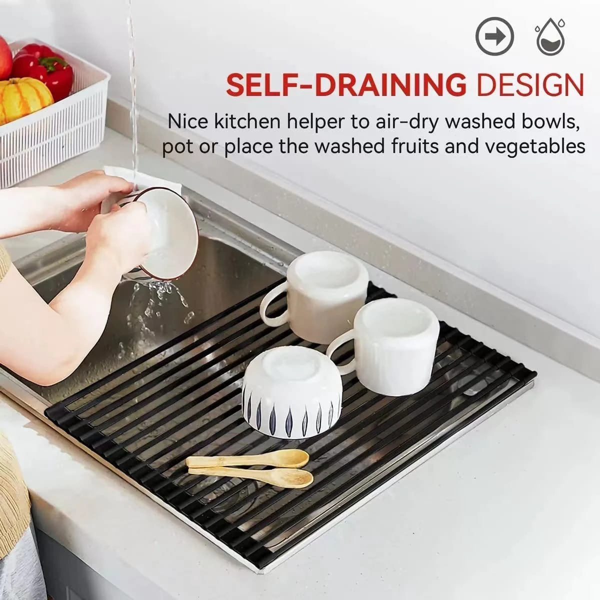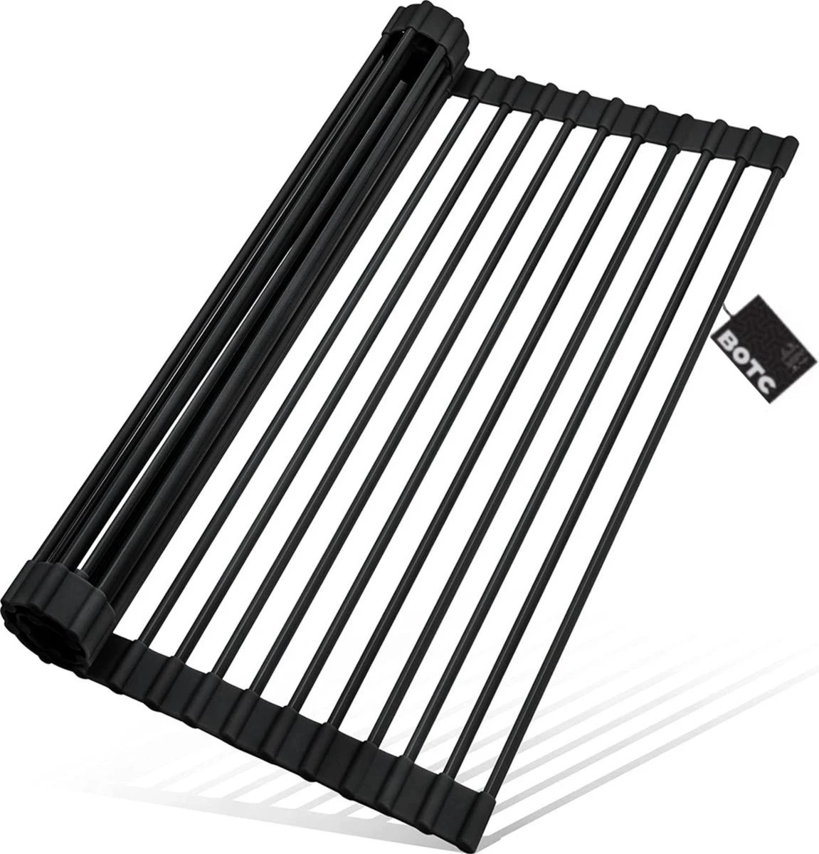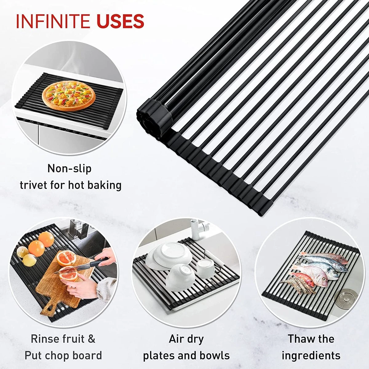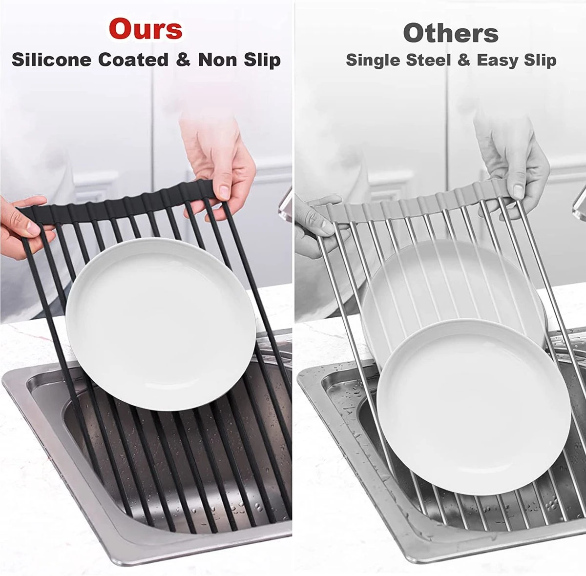 Perfecte maat & opvouwbaar ontwerp: multifunctioneel oprolbaar schotel droogrek is verkrijgbaar in twee maten, geschikt voor de meeste gootstenen en aanrechten. Dit aanrecht droogrek meet 20.5″ lengte bij 13.1″ breedte. De volledig in silicone verpakte stalen gootsteenmatten kunnen worden opgerold tot elke gewenste breedte. NB – Meet uw gootsteen voordat u kiest. Als uw gootsteen kleiner is dan 19.5″, kies dan een 17″x13″ kleiner afdruiprek voor een betere keukenorganisatie.