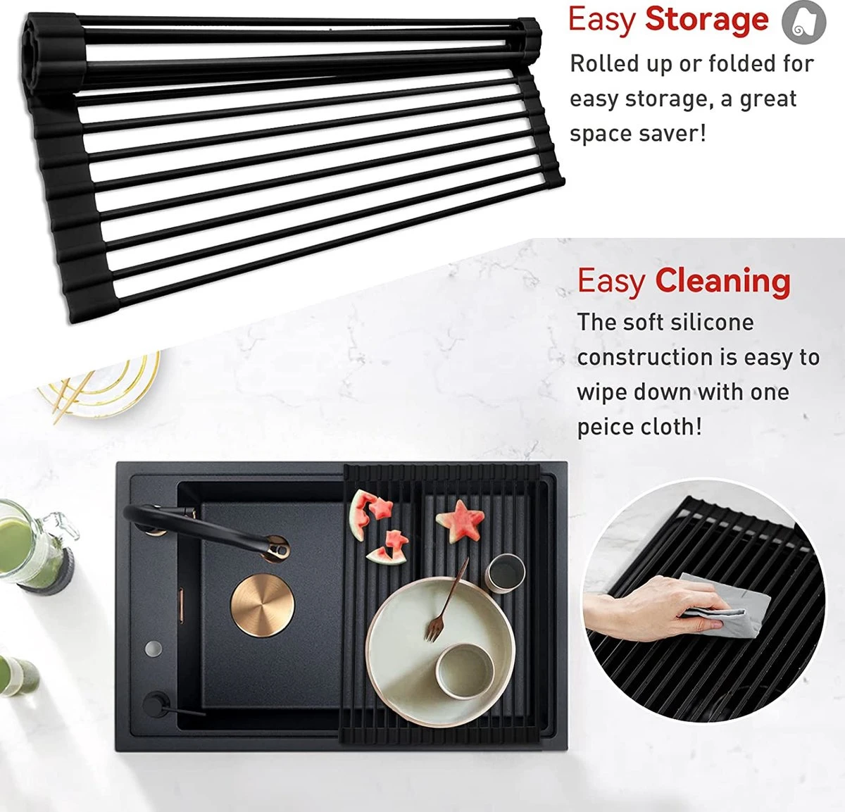 Ruimtebesparend en gemakkelijk schoon te maken: Multifunctioneel oprolbaar droogrek voor keuken boven gootsteen vereist geen montage, rol het gewoon op om gemakkelijk in beperkte ruimte zoals onder de gootsteen te plaatsen wanneer niet nodig, dan om uw keuken altijd netjes te houden. Het gootsteenrek kan veel meer tellerruimte vrijmaken dan traditionele schotelafvoer. De zachte silicone hoeft u alleen maar af te vegen met een doek uit één stuk. Een geweldige aanvulling op keukenaccessoires en appartement benodigdheden. Het zal een warme gift voor nieuw huis zijn.