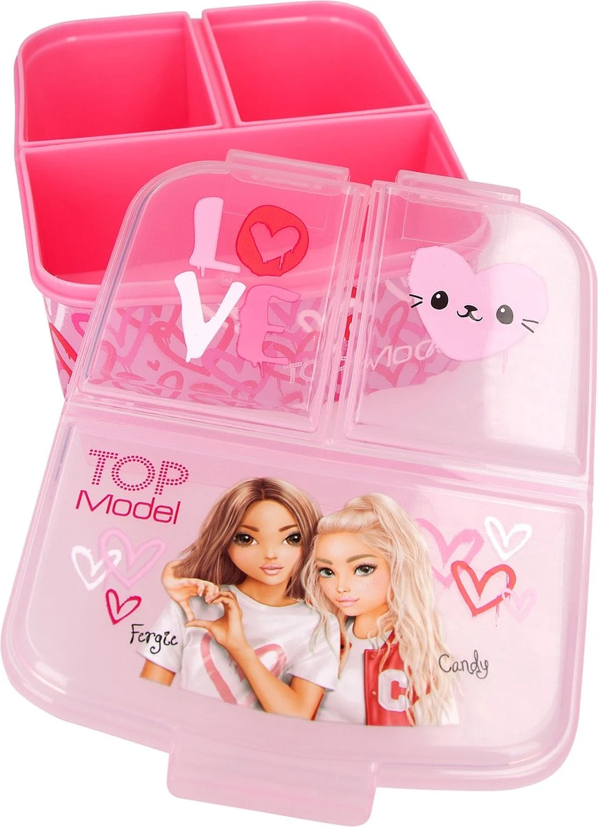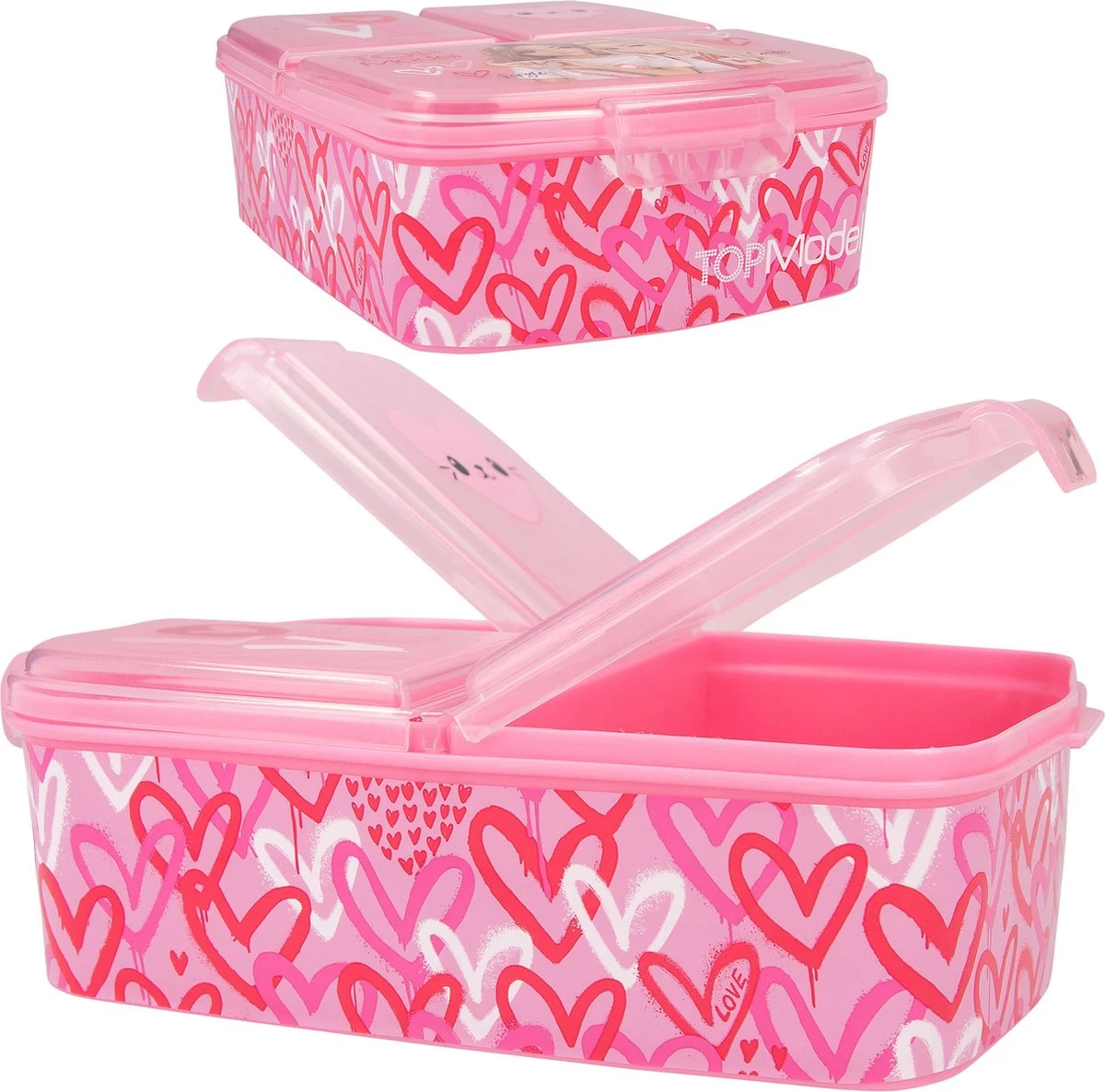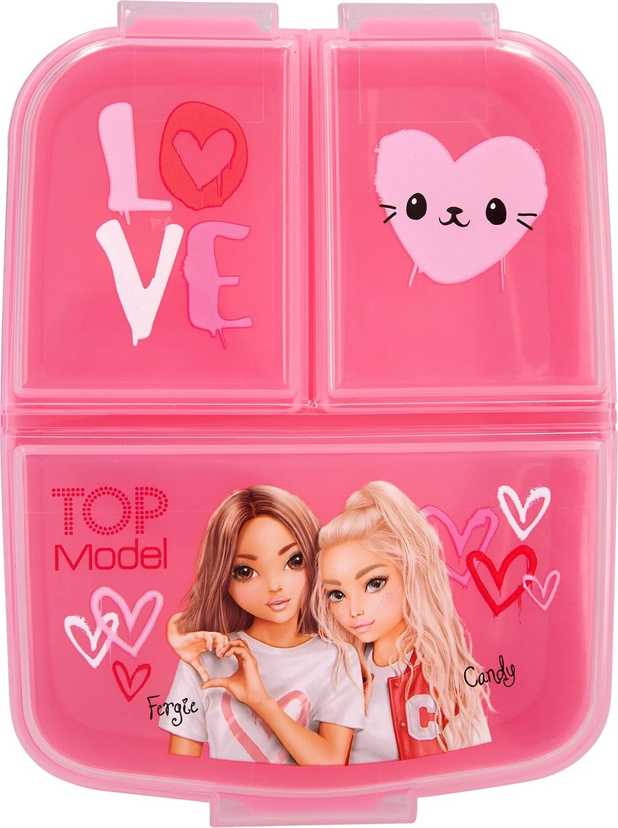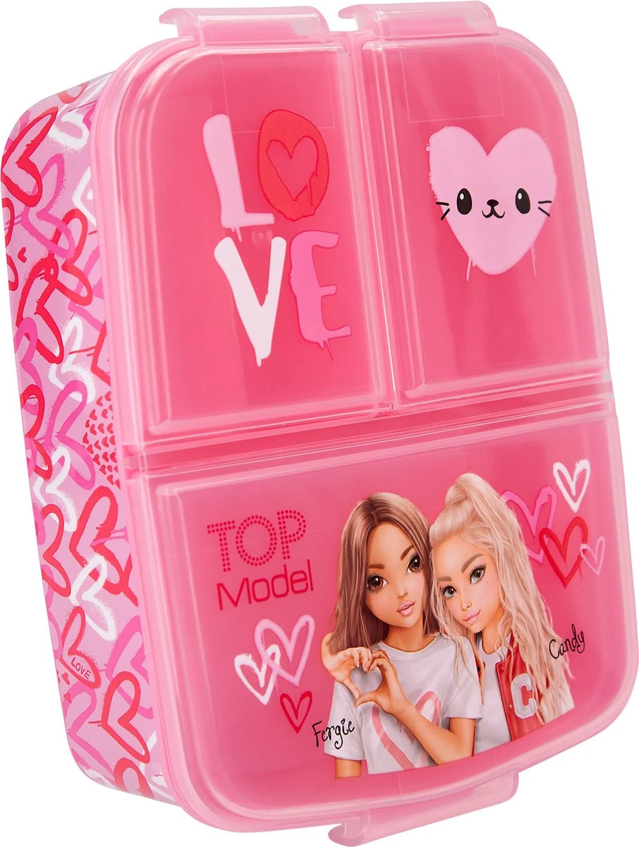 De naam van de TOPModel serie One Love is zeker terug te zien op deze broodtrommel: mooie rood- en rozetinten, een prachtig model, schattige hartjes en trendy teksten. De broodtrommel heeft 3 aparte vakken binnenin (1 groot vak, 2 kleine) met handige kliksluiting.