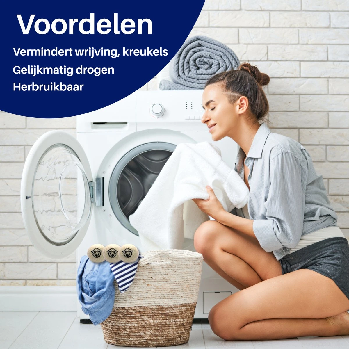 Verkort droogtijd & werkt verzachtend – Het stuiterende lawaai van onze drogende ballen is zeer laag, wat de levensduur van uw droger kan verlengen. Ook verkort het de droogtijd tot wel 30 a 40% wat weer veel elektriciteit bespaart. De drogerballen verwijderen kreukels op kleding wat ervoor zorgt dat uw was erg zacht wordt en makkelijk te strijken is.