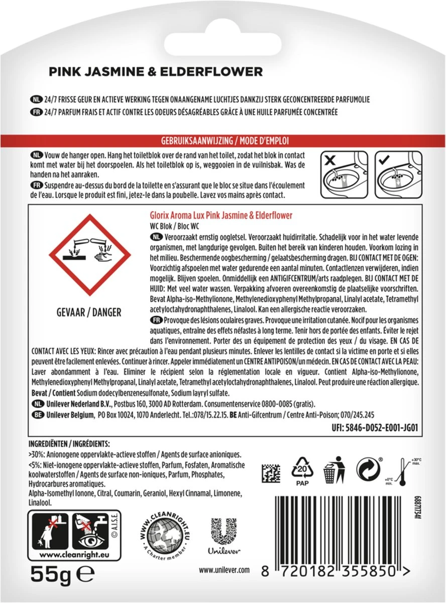 Het Glorix Aroma Lux Toiletblok Pink Jasmine & Elderflower WC Blok geeft 24/7 een heerlijk frisse geur en heeft een actieve werking tegen onaangename geurtjes dankzij geconcentreerde parfumolie. Zo ruikt je toilet altijd heerlijk fris! Bovendien zorgt Glorix Aroma Lux WC Blok bij elke spoelbeurt voor glans en hygiënische reiniging, waardoor je iedere dag geniet van een aangenaam geurend en schoon toilet. De hanger is bovendien 100% recyclebaar!