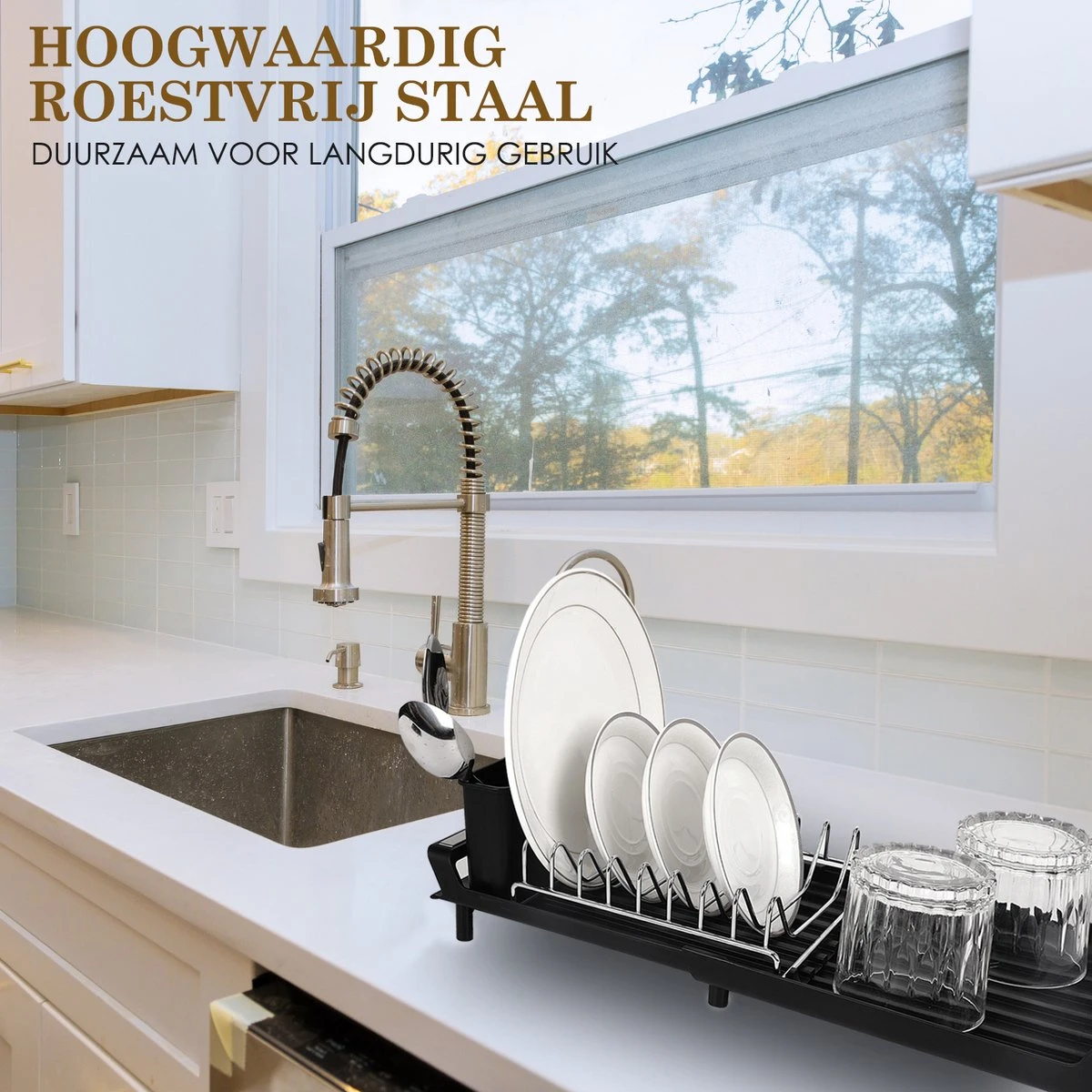 Wil je vaat drogen zonder moeite en omkijken? Heb je last van een laagje water waar de vaat in blijft staan? Het afdruiprek van MIRI is gemaakt van hoogwaardig roestvrij staal en is ontworpen om lang mee te gaan. Het moderne design zal een stijlvolle toevoeging zijn aan elke keuken. Met zijn uitschuifbare ontwerp en opvouwbaar design is het afdruiprek gemakkelijk op te bergen en neemt het weinig ruimte in beslag. Bovendien heeft het afdruiprek een hellend design, zodat het water gemakkelijk af kan lopen en je vaat snel droog is.