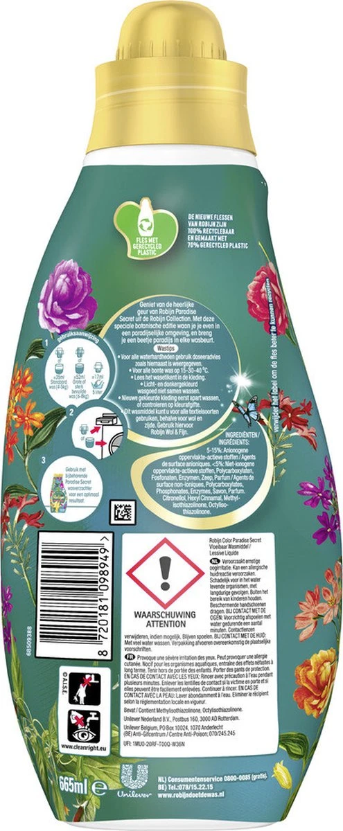 De verbeterde Robijn Paradise Secret formule bevat 80% biologisch afbreekbare ingrediënten. We zijn op weg naar volledig biologisch afbreekbare formules. De vertrouwde effectiviteit en bekende geuren van Robijn, gecombineerd met de kracht van de natuur. Goed voor je kleding en beter voor de planeet. Bovendien zijn de flessen gemaakt van 100% gerecycled en 100% recyclebaar plastic. Op deze manier draagt Robijn bij aan een duurzamere manier van wassen.