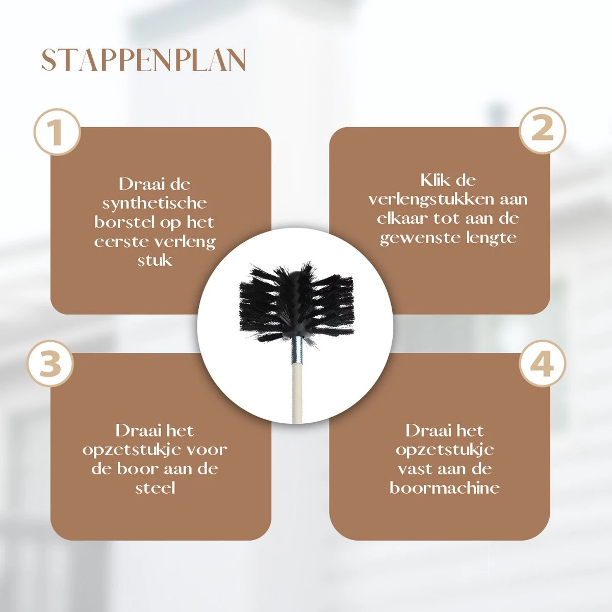 De schoorsteenveegset zowel handmatig als op de boormachine te gebruiken. Door de schoorsteenborstel op de boormachine te monteren ga je sneller te werk én worden hardnekkige plaatsen in een handomdraai schoongemaakt.